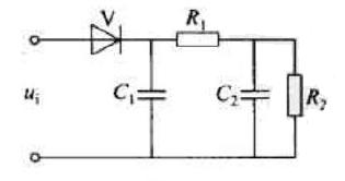 - 简答题 如图所示电路中,R1=4.7kΩ,R2=15kΩ,输入信号电压Ui=1.2V,检波效率设为0.9。求输出电压最大值并估算检波器输入电阻Rin?
