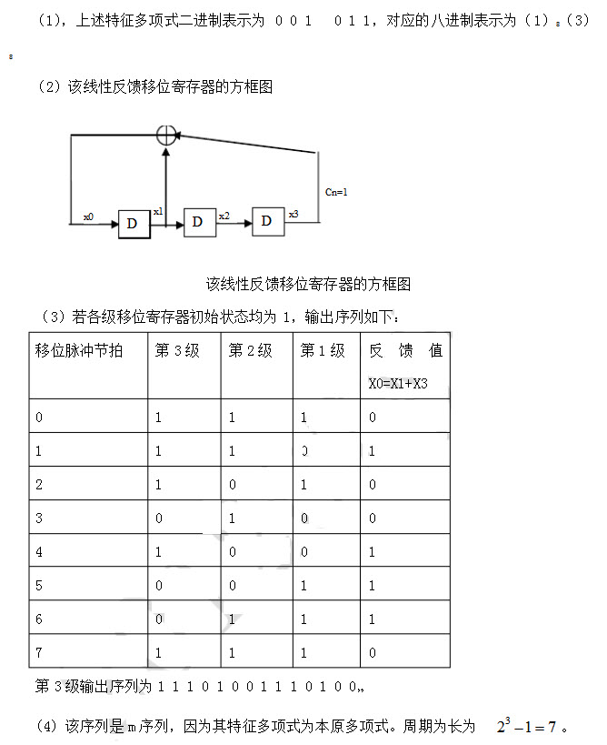 - 简答题已知线性反馈移位寄存器序列的特征多项式x3+x+1, (1)写出特征多项式的八进制表示。 (2)画出该线性反馈移位寄存器的方框图; (3)若各级移位寄存器初始状态为1,写出输出序列。 (4)该序列是否为m序列?为什么?