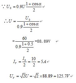 - 简答题有一单相桥式整流半控电路,需直流电压为U0=60V,直流电流I0=10A,α=60°,计算交流电源电压及晶闸管通过的电流和最大反向电压。