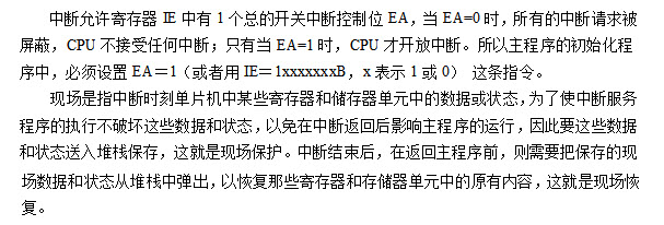 - 简答题编制中断服务程序时,为什么在主程序的初始化程序中,必须设置EA=1这条指令(或达到同样功能的对IE赋值的指令),以及在中断服务程序中为什么通常需要保护现场和恢复现场?