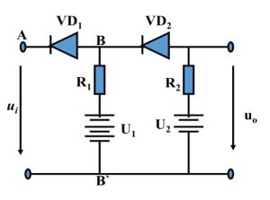 - 简答题下图电路中,VD1和VD2均为理想二极管,直流电压U1>U2,ui、uo是交流电压信号的瞬时值。试求: 1)当ui>U1时,uo=? 2)当ui2时,uo=?