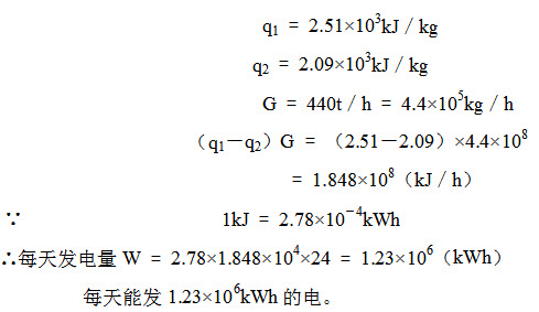 - 简答题1kg蒸汽在锅炉中吸热q1=2.51×103kJ/kg,蒸汽通过汽轮机做功后在凝汽器中放出热量q2=2.09×103kJ/kg,蒸汽流量为440t/h,如果做的功全部用来发电,问每天能发多少电?(不考虑其他能量损失)