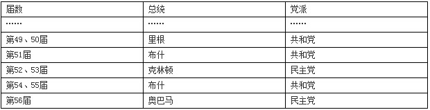 - 单项选择题 新华网华盛顿2008年11月4日电:美国各大电视网公布的初步统计结果显示,美国民主党总统候选人贝拉克·奥巴马在4日举行的总统选举中击败共和党对手约翰·麦凯恩,当选为第56届美国总统。下列表格反映了美国政治制度中的()