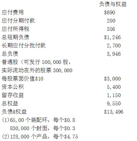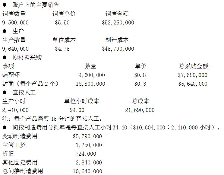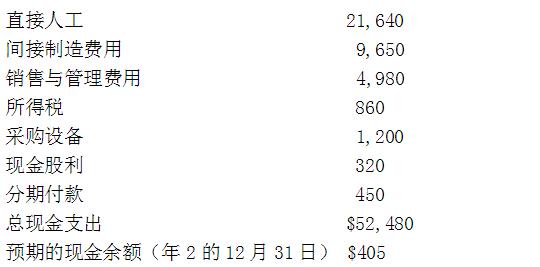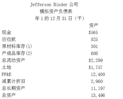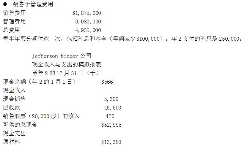Jefferson Binder公司生产笔记本。他的年度全面预算以模拟财务报告而结束。所有的预算安排都已经在年2的12月底完成,从中选取的数据如下所示。还有就是年2 的12月份结束的模拟财务报表的现金收入与支出。为了简化预算过程,Jefferson将原材料、直接人工、制造费用(除了折旧)、销售和管理费用等都归集在一个称为应付费用的账户中。公司的所得税率是40%。所得税费用归类为当前应付所得税