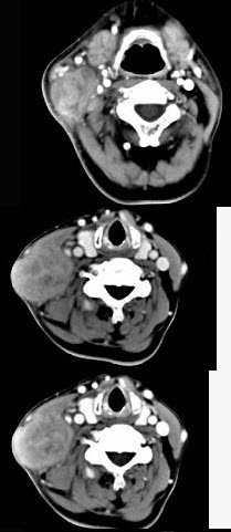 - 男,43岁,右颈部扪及一包块,CT如图所