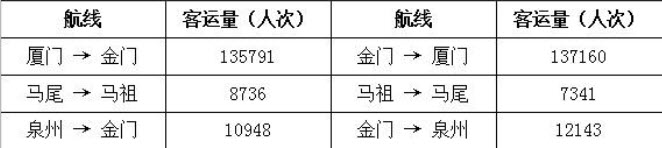 2010年1至3月份,福建沿海地区与台湾地区海上客运直航船舶公司共运营3448航次,共运送旅客312119人次,分别比上年同期增加了11.98%、-4.58%,其中厦门金门航线客运量272951人次,比上年同期减少了2.38%;马尾马祖航线客运量16077人次,比上年同期减少了38.45%;泉州金门航线客运量23091人次,比上年同期增加了12.59%。具体流向、流量情况如下: