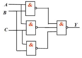 - 简答题利用与非门设计一个逻辑电路,判断三个变量A、B、C中是否有多数个取值为1。定义A、B、C为输入变量,Y为输出变量,当Y=1时表示A、B、C中多数取值为1,否则Y=0。画出逻辑电路图。