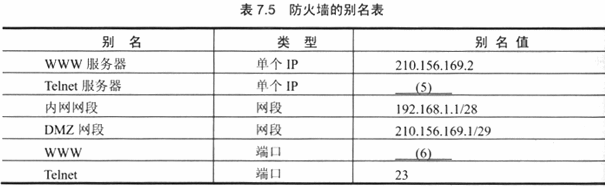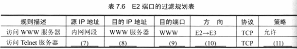 完成防火墙的别名表(见表7.5)和E2端口的过滤规划表(见表7.6),使内网PC能正常访问WWW服务和Telnet服务。