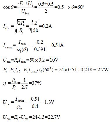 - 简答题 已知谐振功率放大器,晶体管转移特性的斜率Eb=-0.2V,Ec=24V,Uj=0.6V,gcr=0.4A/V,Rc=50Ω,Ubm=1.6V,Po=1W,求Icmax,Ucm,ηc?