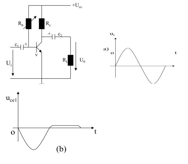 - 判别是什么性质的失真时,要注意共发射极放大电路输出和输入信号相位相反这一特点。图b是截止失真。截止失真是静态工作点位置偏下造成的。解决办法是减小Rb,使Ib增大(Ib=Ucc/Rb)从而使静态工作点向上移动。