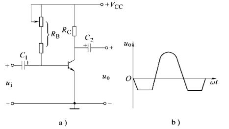- 简答题固定偏置三极管放大电路如图所示,输入正弦交流电时,输出波形如图所示,试判断电路有无失真?是什么失真?产生该失真的原因是什么?如何改善这种失真?